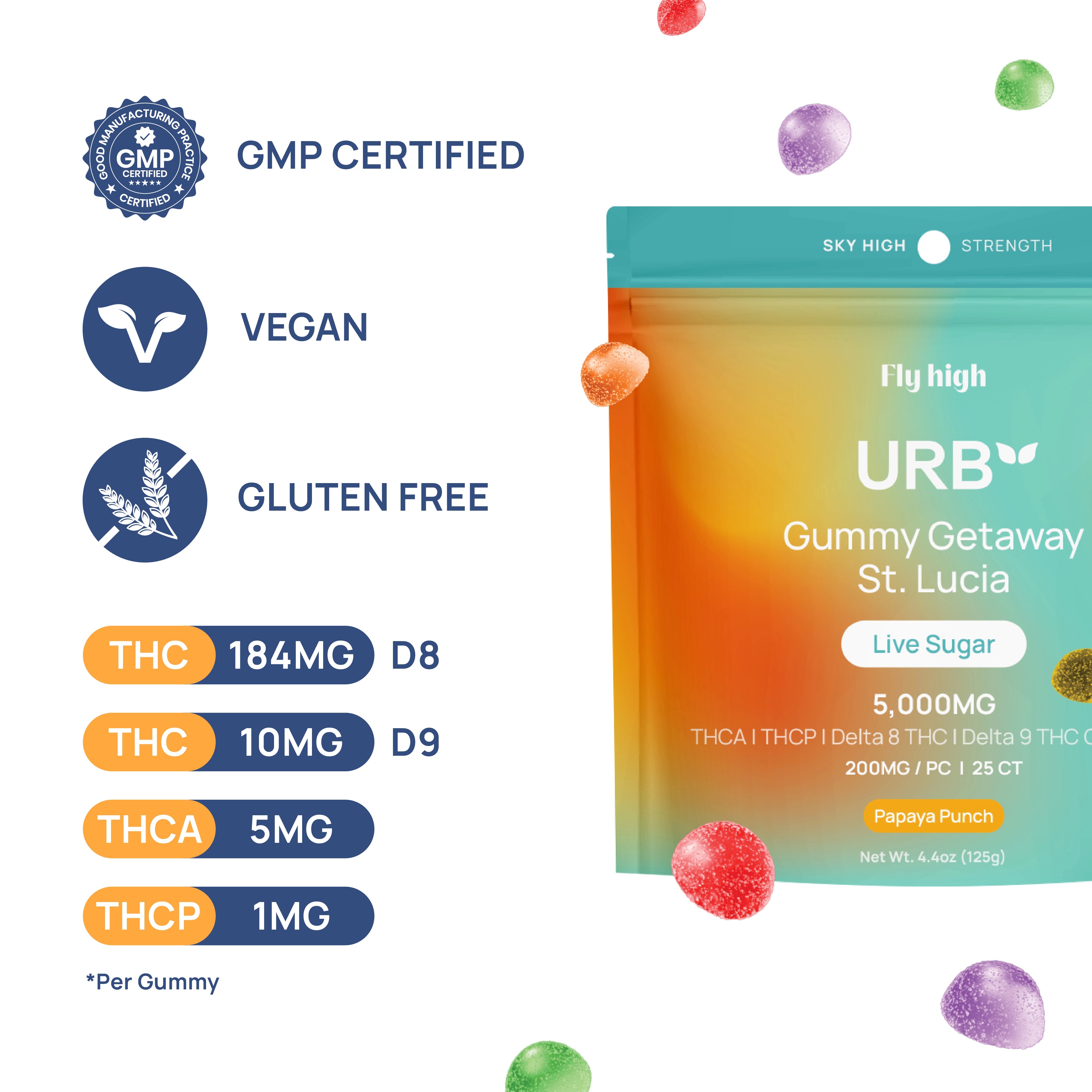 Let Urb’s THCA Live Sugar Gummies invite you to new altitudes of flavor and calm. Inspired by the lush calm of St. Lucia, these 5,000 mg gummies are crafted for seasoned consumers and infused with exotic fruit flavors, hemp-derived cannabinoids, and premium Live Sugar extract—a cannabis concentrate celebrated for its rich terpene profile and bold, full-spectrum effects.
