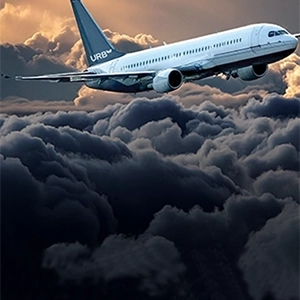 Airplane in clouds with Urb Shop logo
